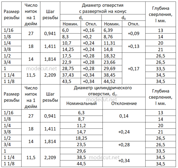 Для получения геометрически правильного профиля конической резьбы необходимо, чтобы предварительно просверленное отверстие также было коническим. Для этого необходимо использовать специальный режущий инструмент, имеющий нужную конусность (конусность 1:16). Однако в случае отсутствия такого инструмента отверстие под нарезку дюймовой резьбы может быть цилиндрическим, что также допустимо (см. рис.1). Размеры и предельные отклонения конических и цилиндрических отверстий под нарезку дюймовой конической резьбы в зависимости от их номинального размера приведены в таблице.