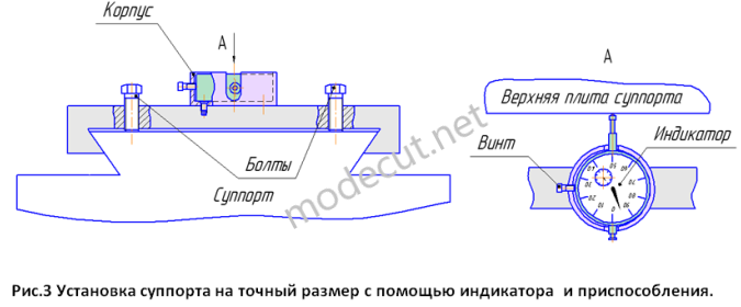 Еще одним вариантом установки индикаторной головки на точный размер, является её крепление в приспособлении, показанном на рисунке 3. Приспособление состоит пластины, корпуса и зажимных болтов. Как показано на рисунке 3 приспособление устанавливается на ласточкин хвост суппорта и фиксируется двумя болтами. Посередине приспособления расположен корпус, в который устанавливается индикаторная головка и фиксируется винтом. При этом наконечник индикаторной головки должен упираться в верхнюю плиту суппорта станка. Это приспособление обычно используется при постоянных чистовых операциях, так как штатив довольно громоздкий и немного мешает станочнику в процессе обработки детали.
