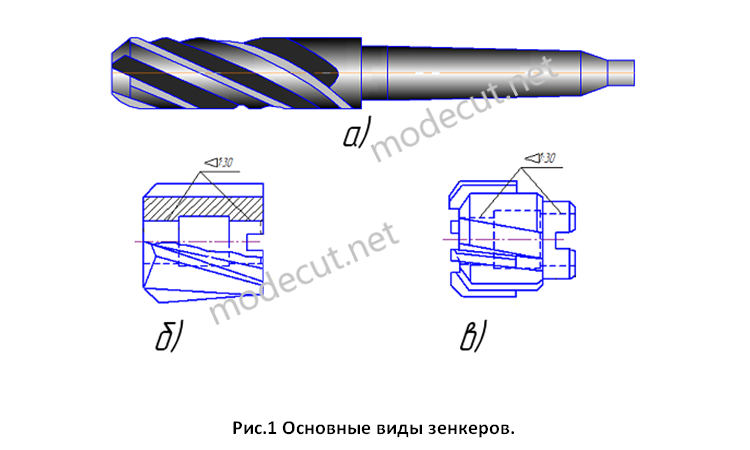 Зенкерование. Процесс зенкерования используется для повышения точности обрабатываемых отверстий и снижения шероховатости их поверхностей после сверления. Зенкерование выполняют режущим инструментом, называемым зенкером. Зенкеры изготовляют следующих типов: цельные с коническим хвостовиком (рис.1а), хвостовые с напаянными пластинками из твердого сплава, насадные с напаянными пластинками из твердого сплава (рис.1б) или со вставными ножами (рис. 1в).