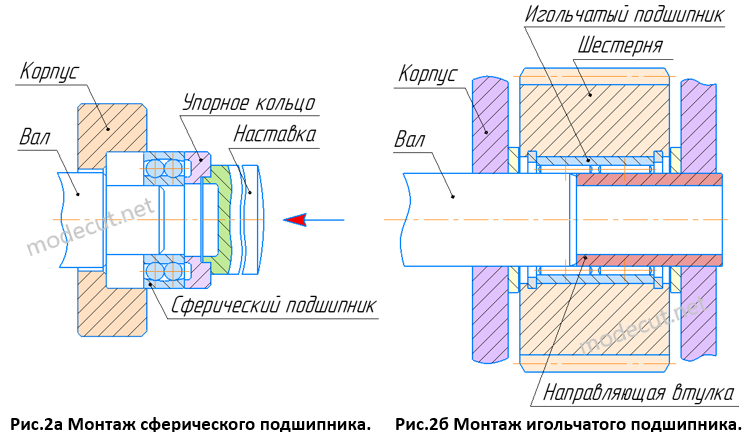 Стоит отметить, что при установке сферического подшипника использование упорного кольца позволяет избежать перекоса наружного кольца в момент входа его в корпус (см. рис.2а). При установке цилиндрических игольчатых подшипников без внутреннего кольца рекомендуется использовать направляющую втулку (см. рис. 2б). Наружный диаметр втулки имеет такой же диаметр как у посадочной шейки вала, но изготовлен с допуском d10.
