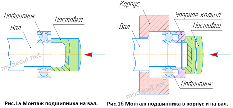Установку подшипника на поверхность с переходной посадкой можно выполнить легкими ударами молотка по втулке, прижатой к одному из колец подшипника. При этом удары молотка должны равномерно распределяться по окружности торца втулки, предотвращая возможный перекос подшипника. В случае установки подшипника на посадочную поверхность с натягом необходимо использовать специальную наставку (см. рис.1а), которая при монтаже упирается в торец посадочного кольца и равномерно распределяет осевое усилие. Если подшипник устанавливается на поверхность с маленьким натягом, то монтаж можно выполнить и при помощи молотка. Однако удары молотком наносятся только по наставке. Монтаж подшипника на поверхность с большим натягом выполняется при помощи механического или гидравлического пресса.