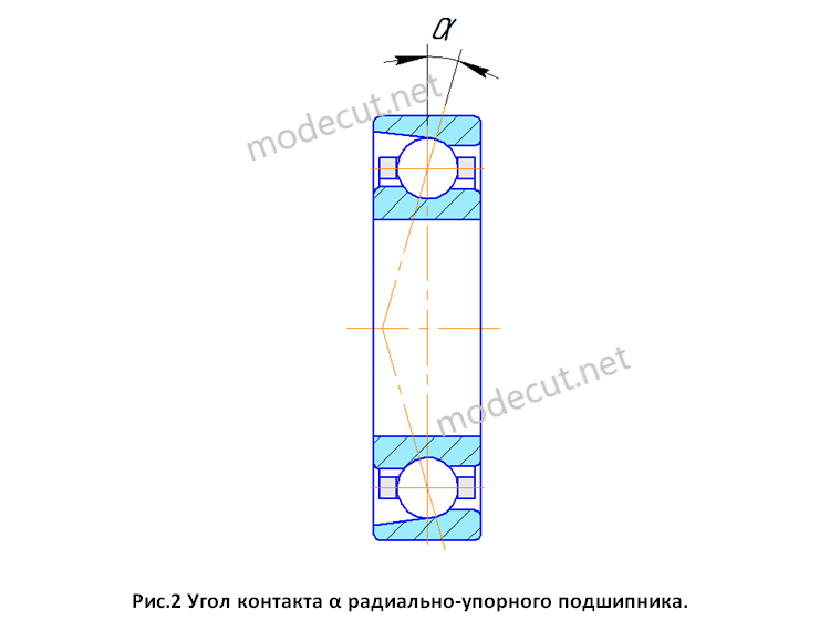 Угол контакта это угол между перпендикуляром центральной оси подшипника и линией проходящей через точки контакта тела качения и рабочих дорожек (см. рис.2). По этой линии проходит нагрузка на подшипник.